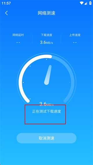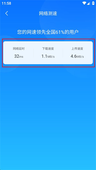 3、等待测速完成,查看显示的网络延时、下载速度、上传速度等结果。