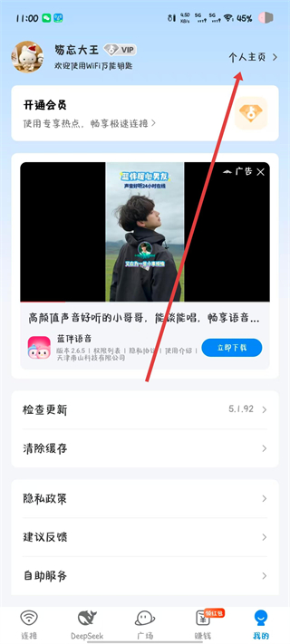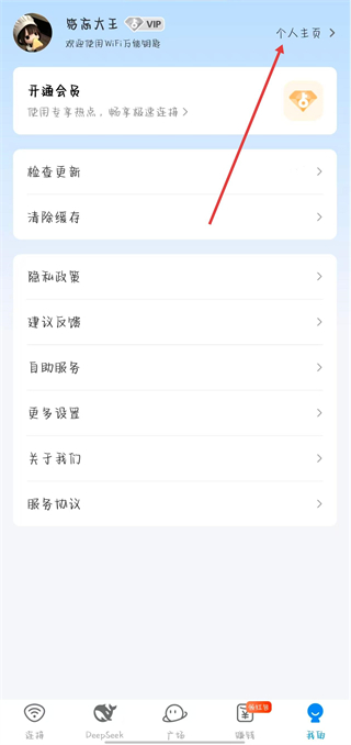 1、打开WiFi万能钥匙进入我的页面,点击右上角个人主页。