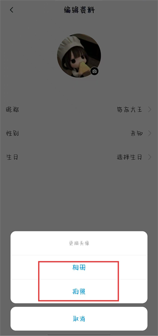 4、在弹出的选项中选择相册或拍照,即可更改。