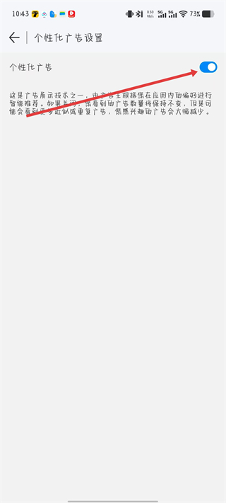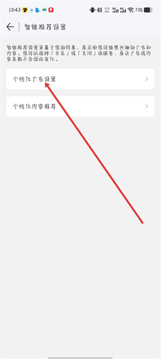 4、在智能推荐设置页面,点击个性化广告设置选项。