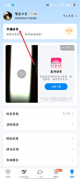 2、在个人页面中,找到开通会员区域,点击进入WiFi万能钥匙的会员开通页面。