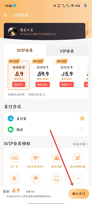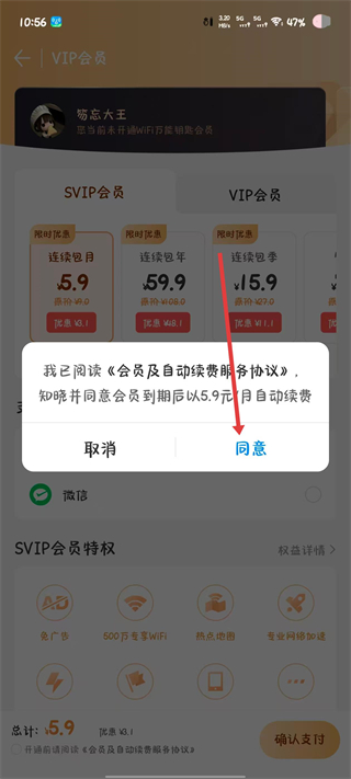 4、勾选开通前请阅读协议框,点击确认支付,在弹出的协议窗口中点击同意完成开通。