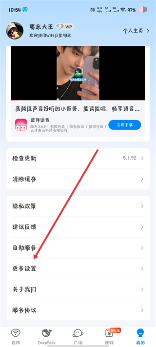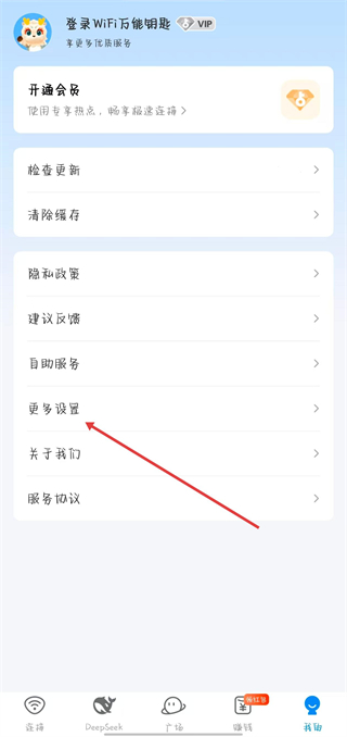 1、打开WiFi万能钥匙,在我的页面,点击更多设置。
