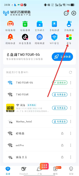 1、打开WiFi万能钥匙APP,点击页面上方的更多选项。