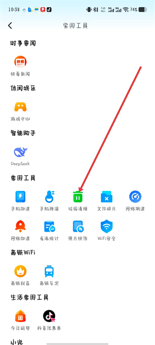 2、在实用工具页面的常用工具板块中,点击垃圾清理。