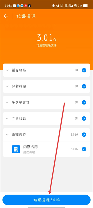 2、将会自动找寻手机中的缓存垃圾、卸载残留、多余安装包、广告垃圾和清理内存,一键清理减少手机负担;