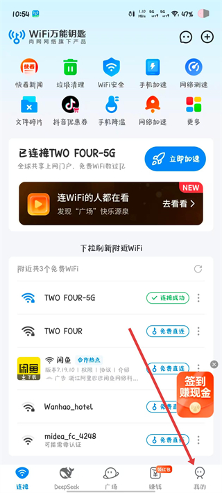 1、打开WiFi万能钥匙进入连接页面,点击底部导航栏最右侧我的选项进入个人页面。