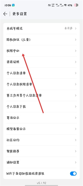 3、在更多设置页面中,找到权限中心选项,点击进入权限中心的管理界面。