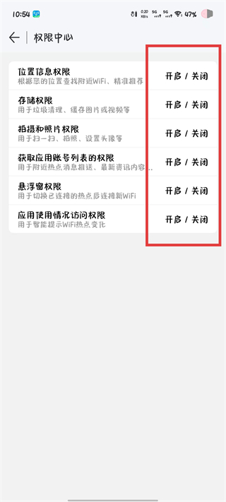 4、在权限中心界面里,找到对应权限的开启/关闭按钮,点击即可调整该权限状态。