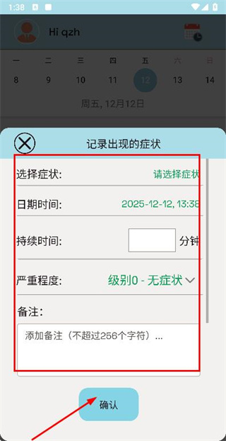 3、在症状记录页面填写所需信息后,点击确认按钮完成症状记录操作。