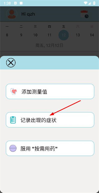 2、在操作选项窗口中点击记录出现的症状选项,进入症状记录页面。
