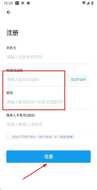 3、在注册账号页面填写验证码和密码,勾选协议后点击注册完成账号注册操作。