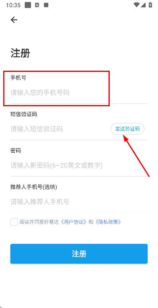 2、在注册账号页面填写手机号码后,点击发送验证码。
