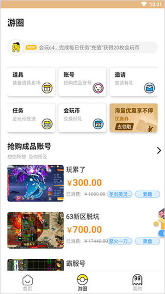 3、在游圈板块,有丰富的道具、账号、任务等等,支持玩家再次去抢购一些高级的账号,做任务领取金币等;