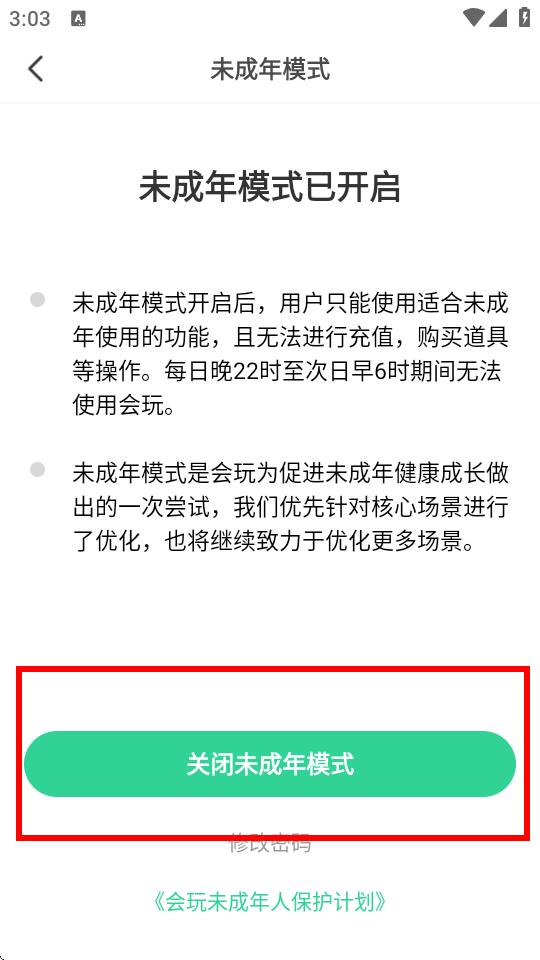 2、在弹出的未成年模式已开启界面中,点击关闭未成年模式按钮。