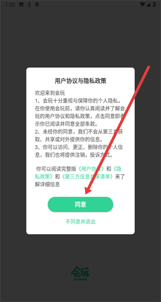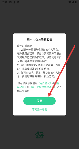 1、打开会玩APP,弹出用户协议与隐私政策窗口,点击同意按钮后进入。