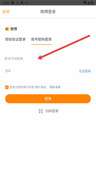 4、在微博登录页面,输入手机号或邮箱以及密码,点击“登录”按钮,完成账号登录流程。