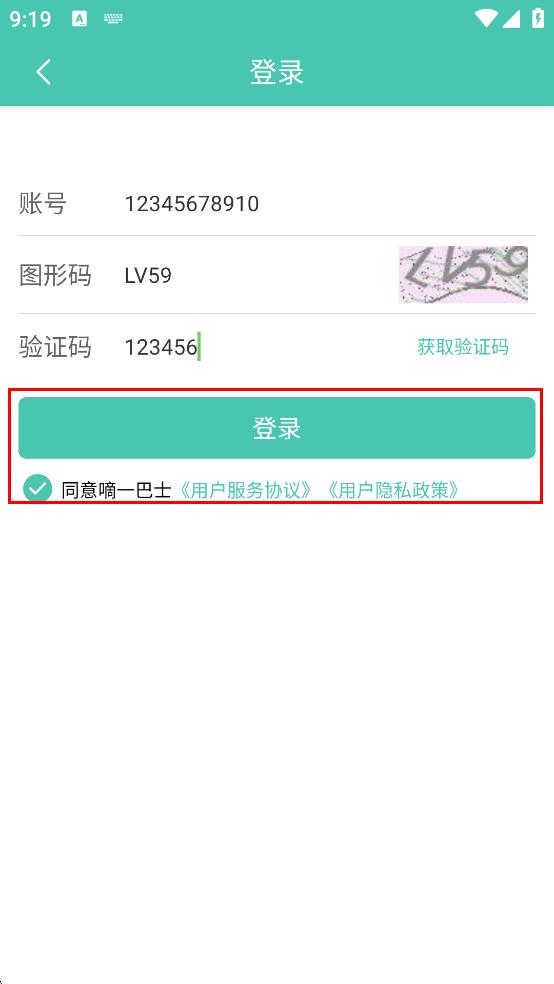 4、勾选同意嘀一巴士用户服务协议,用户隐私政策,然后点击绿色的“登录”按钮,完成登录。