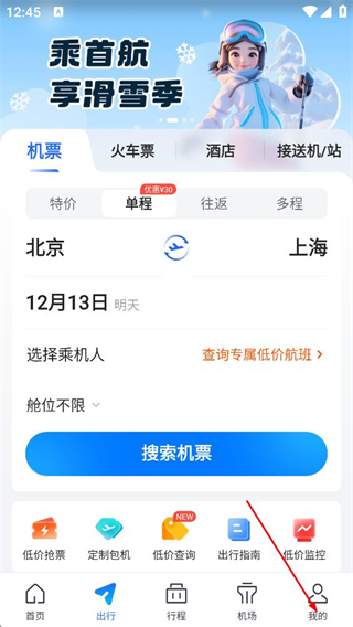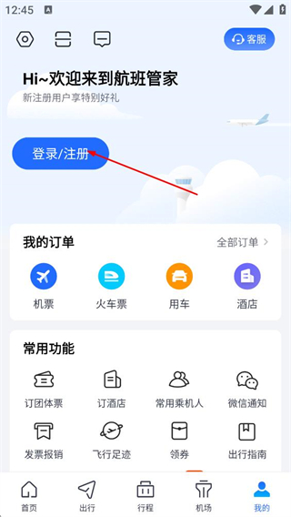 1、在航班管家首页,点击底部我的选项,进入个人中心页面。
