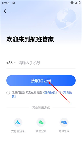 4、在输入验证码页面,填写收到的验证码,完成航班管家的账号登录。