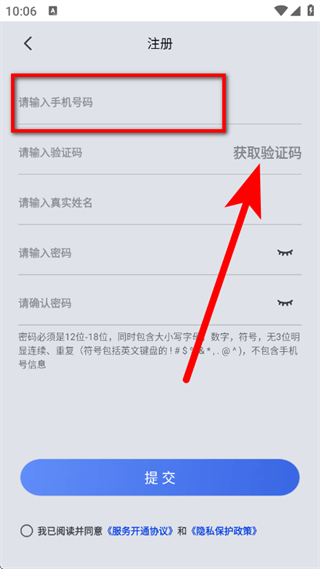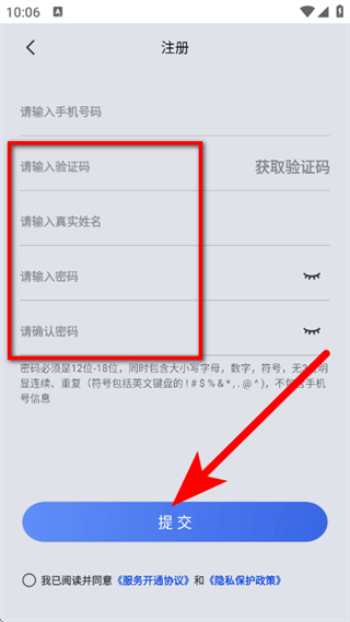 5、输入验证码、真实姓名及密码后,勾选协议,点击提交,完成注册。