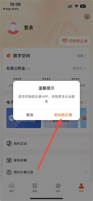 3、在温馨提示弹窗里,点击前往皖企通选项,即可切换到皖企通服务。