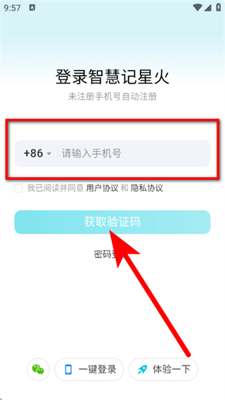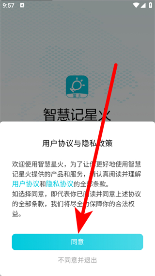 1、打开智慧记星火,在提示框,点击同意,进入登录界面。