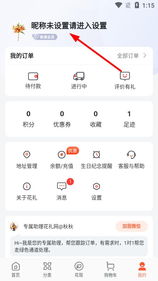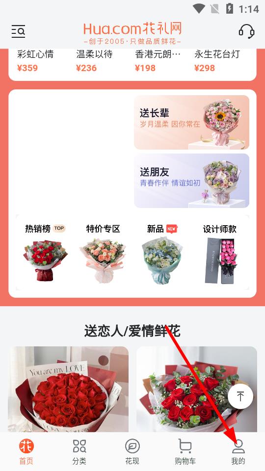 1、打开花礼网app,点击底部导航栏中的我的进入个人中心页面。