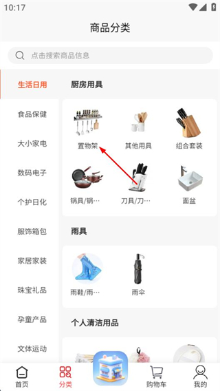 2、在分类页面,选择厨房用具下的置物架选项,进入对应商品列表页。
