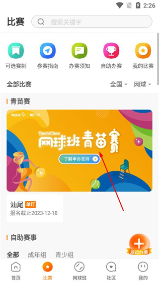 1、打开网球班app,点击底部导航栏的比赛,进入比赛页面。