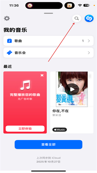 2、进入我的音乐页面内,点击右上搜索的功能图标。