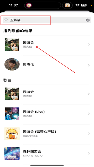 4、在输入框内输入歌曲名称后,点击下方对应曲目即可。