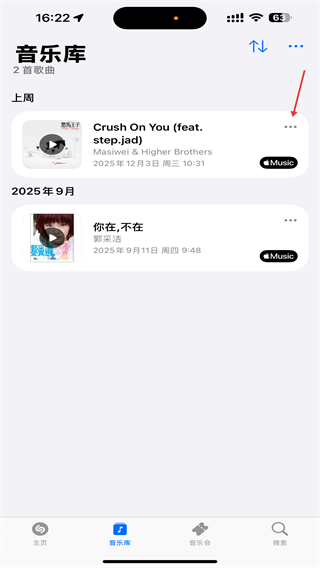 2、在音乐库的页面内,点击音乐右侧三个点的功能按钮。