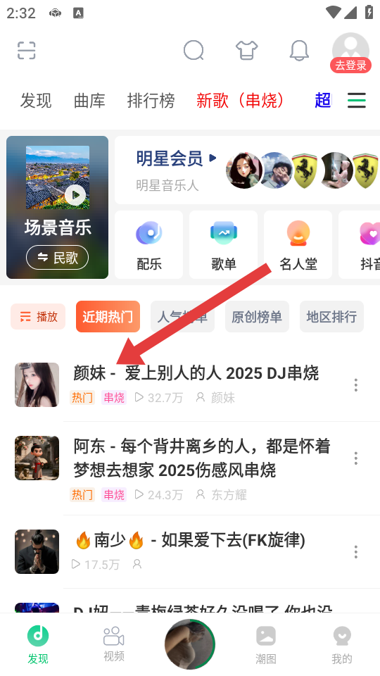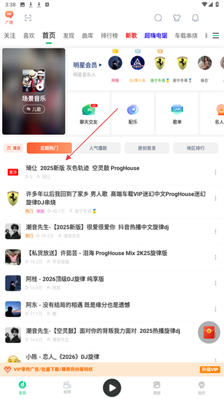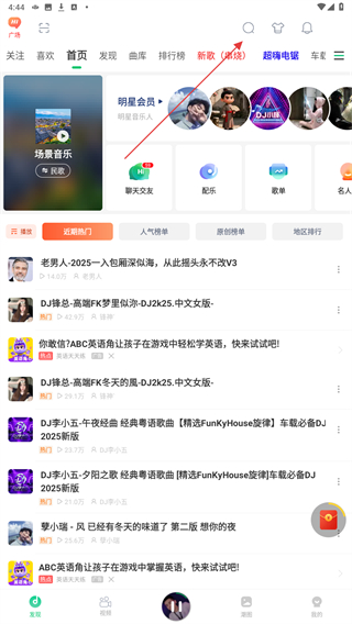 打开软件,在发现界面,为你推荐近期热门歌曲,在这里你可以分类查找,排行榜,专辑等内容的呦·