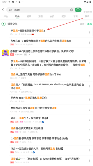3、搜索结果出来后,找到对应的目标歌曲点击名称即可。