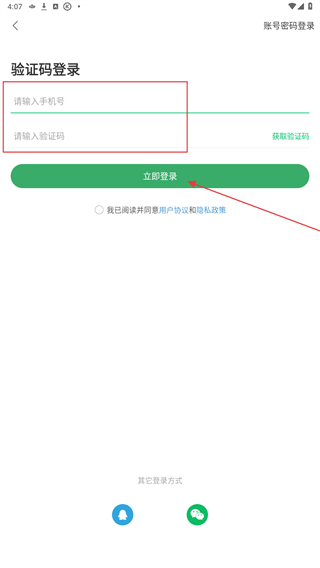 4、输入手机号、验证码,再点击立即登录的按钮即可完成。