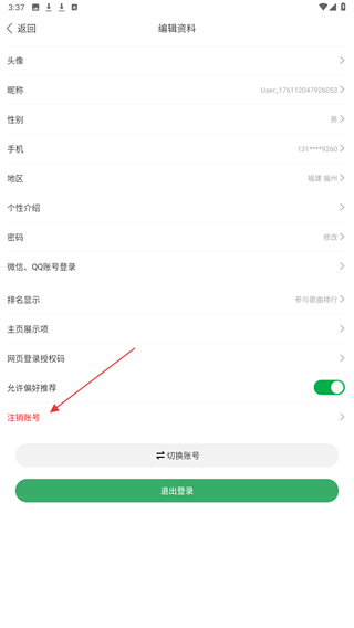 4、进入编辑资料的页面内,点击注销账号的按钮即可。