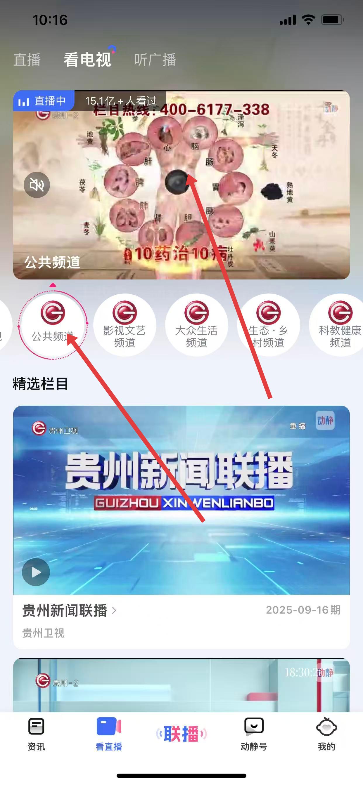 4、若想切换其他频道,如公共频道,点击对应频道选项,就能观看该频道直播。