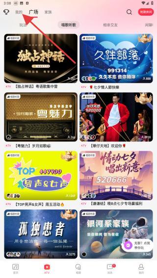 1、点击底部导航栏的KTV,呈现出广场的页面,再点击我的跳转至该页面。