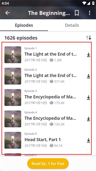 3、在作品详情页的Episodes标签下,可查看各章节的列表及相关播放数据。