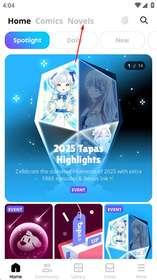 1、打开Tapas软件的Home界面,点击顶部的Novels选项,切换到小说板块。