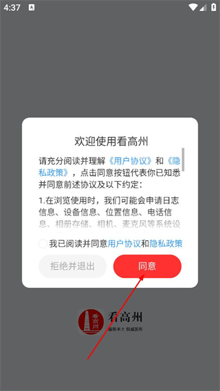 1、在用户协议弹窗中,点击同意按钮,进入应用首页。