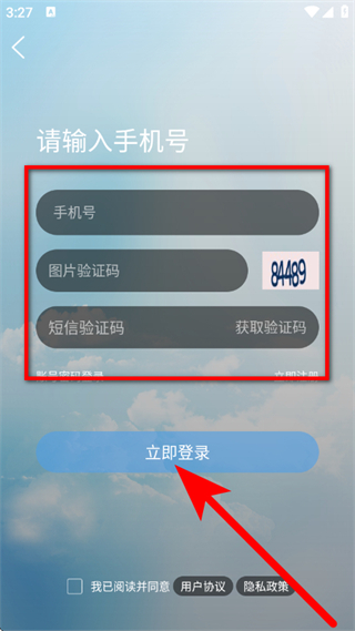 4、输入手机号,输入验证码,勾选协议,点击立即登录,完成登录。