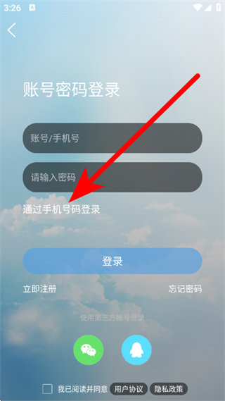 3、在登录页面,点击通过手机号码登录,进入手机号登录页面。
