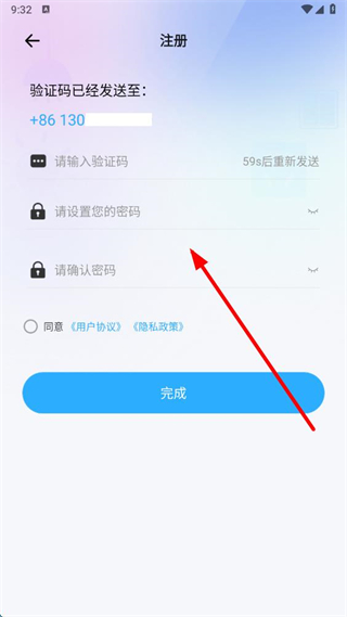 4、输入收到的验证码,设置并确认密码,勾选同意用户协议,点击完成按钮,即可完成账号注册。