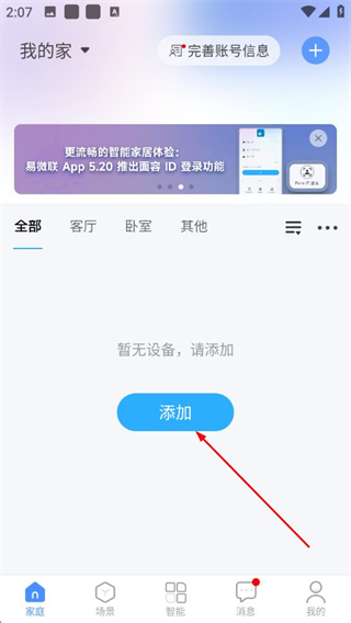 1、打开易微联APP,在家庭页面点击添加,进入添加设备流程。