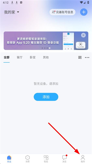 1、打开易微联app,点击底部我的选项,进入个人界面。