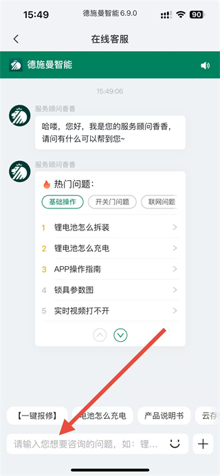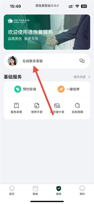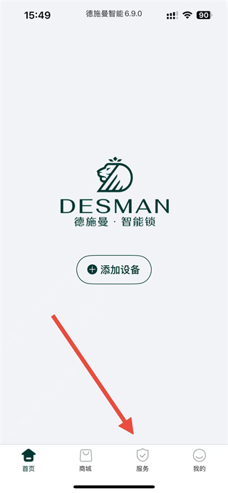 1、打开德施曼智能应用,点击底部服务选项,进入服务相关界面。