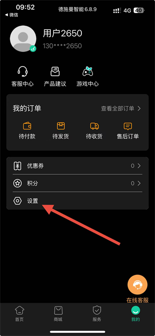1、在德施曼智能app我的页面点击设置选项,进入设置页面。