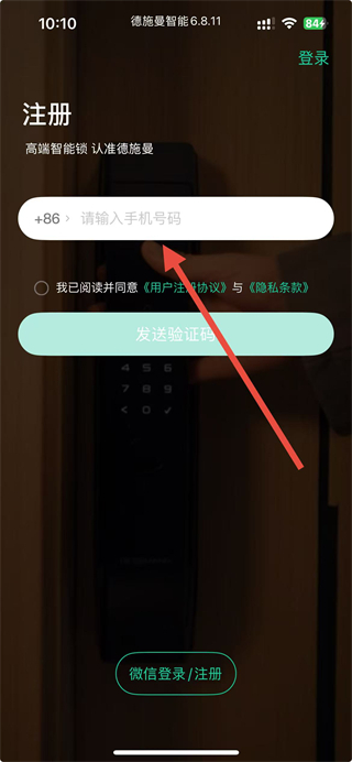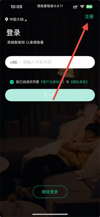 1、打开德施曼智能app,在登录页面点击右上角注册选项,进入注册页面。